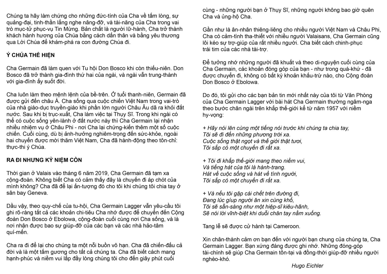 Do đó, tôi gửi cho các bạn bản tin mới nhất này của tôi từ Văn Phòng của Cha Germain Lagger với bài hát Cha Germain thường ngâm nga theo bước chân ngài trên khắp thế giới kể từ năm 1957 với niềm hy vọng: