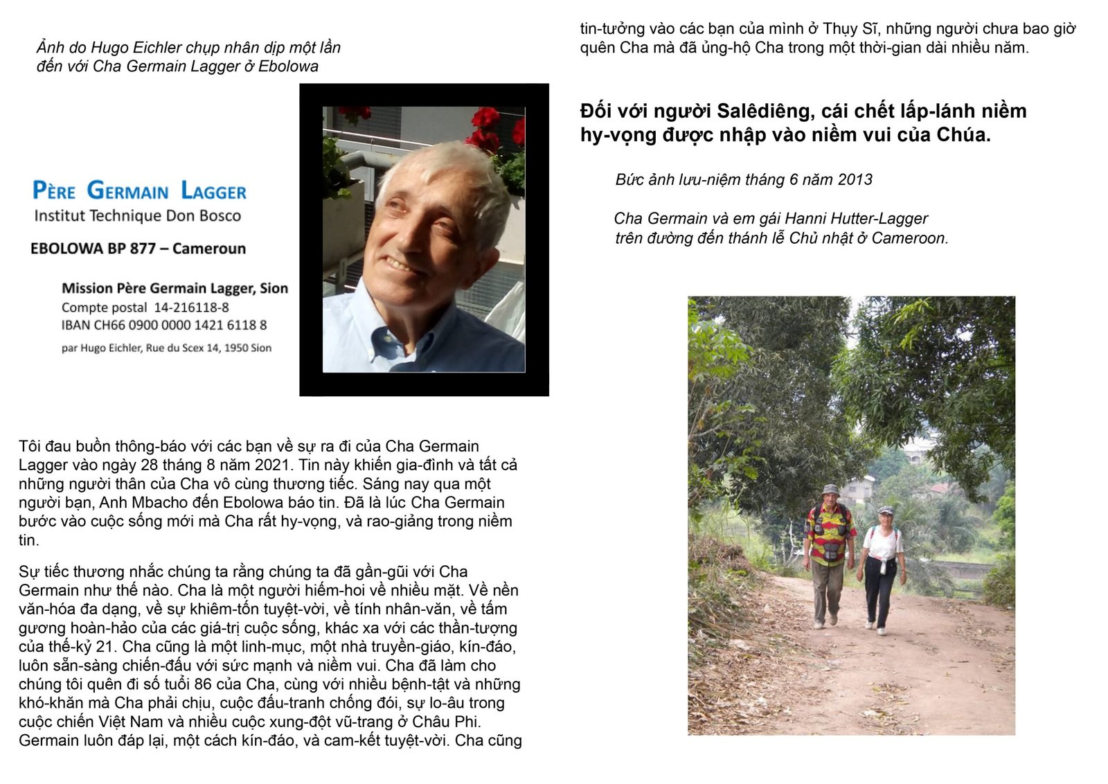 Tôi đau buồn thông báo với các bạn về sự ra đi của Cha Germain Lagger vào ngày 28 tháng 8 năm 2021. Tin này khiến gia đình và tất cả những người thân của Cha vô cùng thương tiếc. Sáng nay qua một người bạn, Anh Mbacho đến Ebolowa báo tin. Đã là lúc Cha Germain bước vào cuộc sống mới mà Cha rất hy vọng, và rao giảng trong niềm tin.