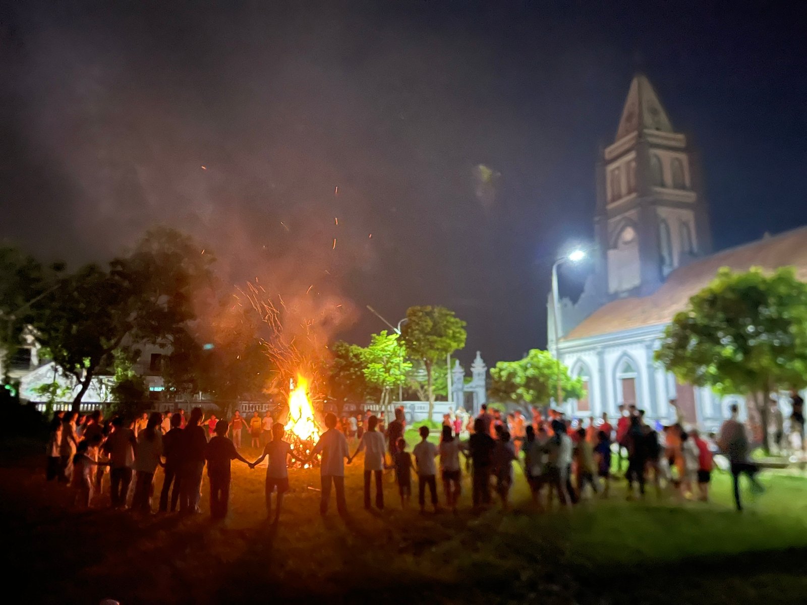 Chương trình buổi chiều được tiếp tục với phần trò chơi lớn thật sinh động. Sau khi bữa ăn chiều kết thúc, các nhóm tiếp tục chuẩn bị cho các tiết mục trong đêm lửa trại. Thật ý nghĩa hơn nữa khi trong đêm lửa trại, các bạn nhỏ được quây quần để thỏa sức reo hò bên đống lửa được thắp sáng từ ngọn tháp nhà thờ.