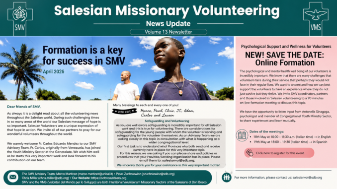 Trong số các sáng kiến được nêu bật, bản tin thông báo về một khóa đào tạo trực tuyến dành riêng cho sức khỏe tâm lý của các tình nguyện viên, dự kiến diễn ra vào ngày 18 và 19 tháng 5 năm 2026 bằng tiếng Anh và tiếng Tây Ban Nha. Sáng kiến này nhằm mục đích cung cấp các công cụ hỗ trợ các tình nguyện viên trong những thách thức về cảm xúc và các mối quan hệ có thể nảy sinh trong quá trình phục vụ của họ, để đảm bảo sự thành công trọn vẹn cho các trải nghiệm tình nguyện của họ.