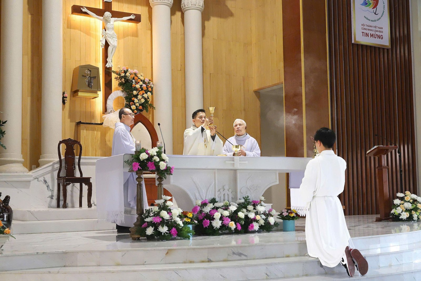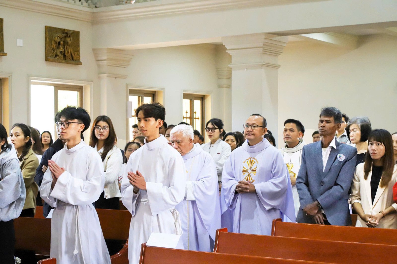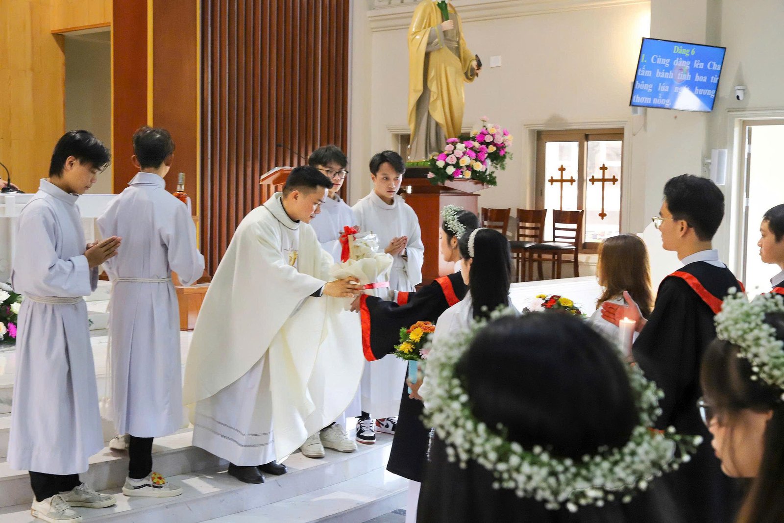 Sau thời gian giao lưu thân mật, mọi người cùng nhau bước vào Thánh lễ trọng thể lúc 10g00, đỉnh cao của hai ngày lễ hội, để dâng lên Thiên Chúa lời tạ ơn sâu xa nhất trong đức tin. Thánh lễ do Cha Phanxicô Xaviê Trần Quốc Tuấn, Đặc trách nhóm sinh viên, chủ tế, có sự hiệp dâng của Quý Cha Học viện Don Bosco Đà Lạt, Quý Ban linh hướng, Quý ân nhân, phụ huynh và đông đảo các bạn sinh viên.