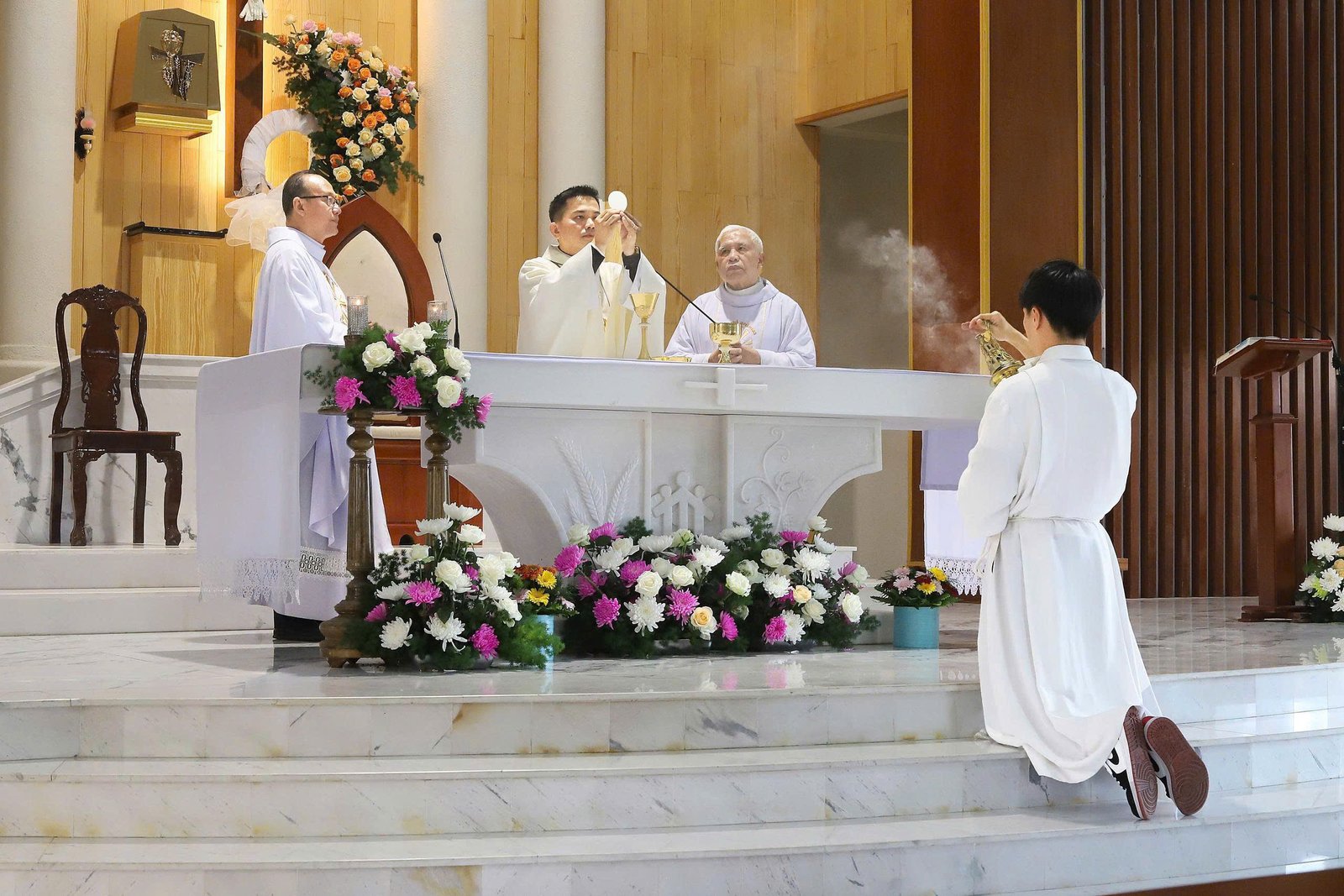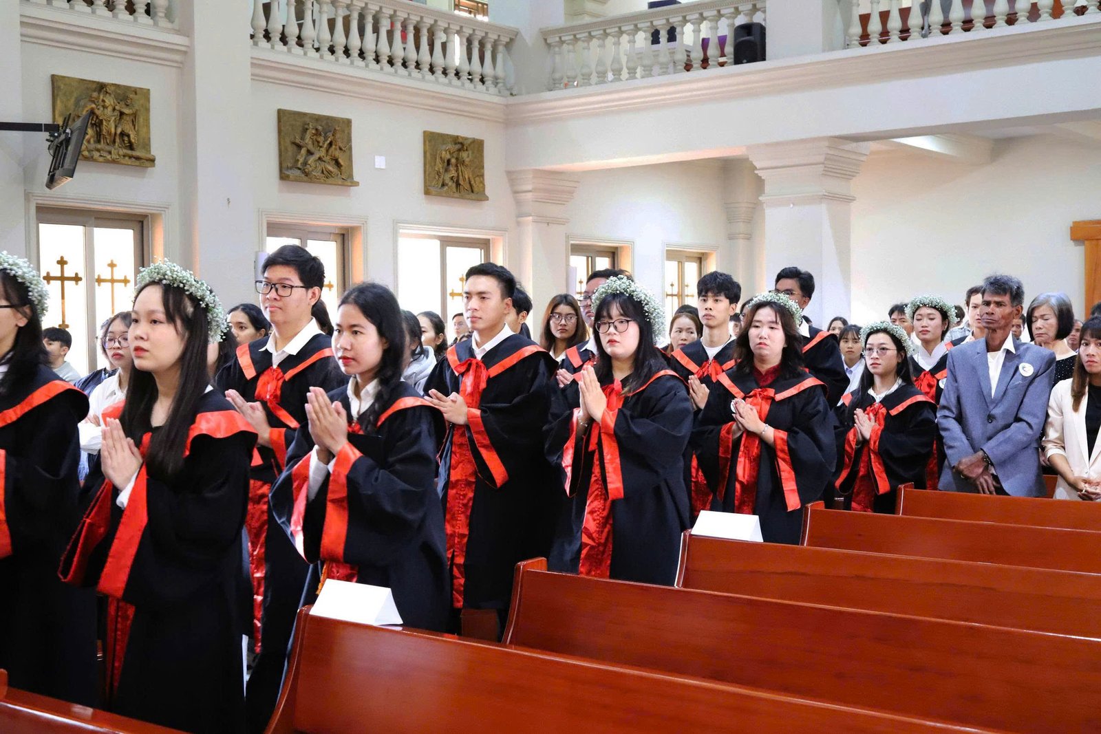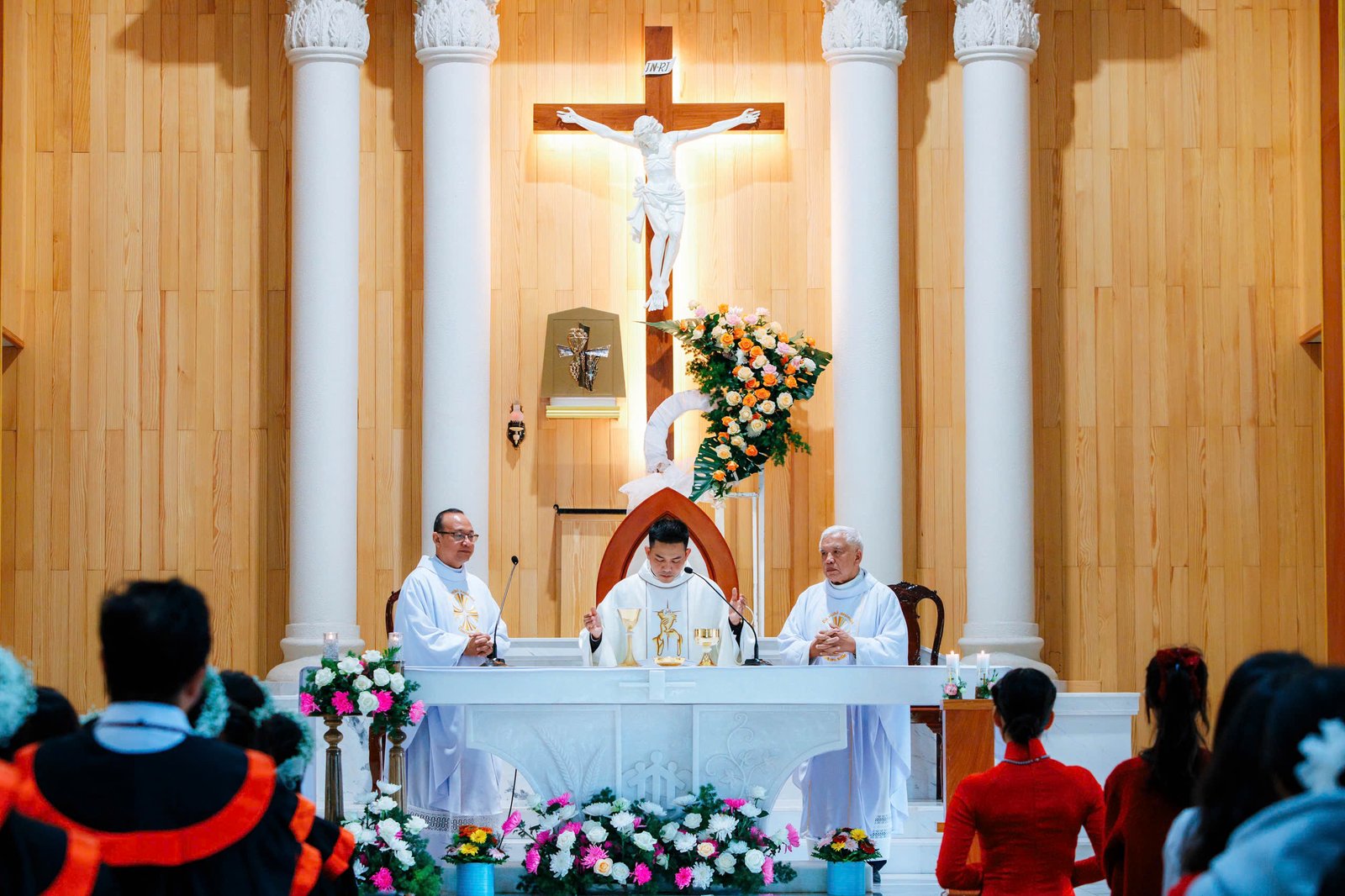 Sau thời gian giao lưu thân mật, mọi người cùng nhau bước vào Thánh lễ trọng thể lúc 10g00, đỉnh cao của hai ngày lễ hội, để dâng lên Thiên Chúa lời tạ ơn sâu xa nhất trong đức tin. Thánh lễ do Cha Phanxicô Xaviê Trần Quốc Tuấn, Đặc trách nhóm sinh viên, chủ tế, có sự hiệp dâng của Quý Cha Học viện Don Bosco Đà Lạt, Quý Ban linh hướng, Quý ân nhân, phụ huynh và đông đảo các bạn sinh viên.