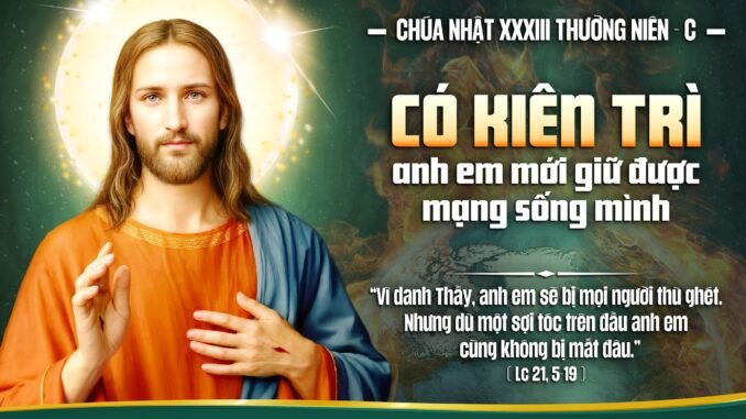 Kính thưa cộng đoàn, Chúa Giêsu không muốn chúng ta sợ hãi về tương lai. Ngài muốn chúng ta là những người con can đảm của hiện tại.Đền Thờ đích thực không bị sụp đổ chính là tâm hồn mỗi chúng ta, nơi Thiên Chúa ngự trị. Và cách chúng ta bảo vệ, xây dựng Đền Thờ đó chính là qua sự kiên trì.