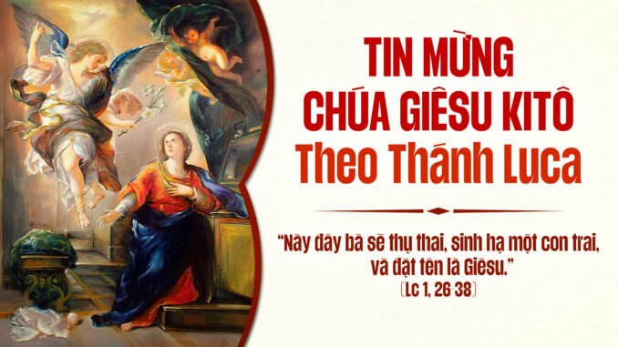 “Thiên thần vào nhà trinh nữ và chào rằng: ‘Kính chào Trinh Nữ đầy ơn phúc, Đức Chúa ở cùng Trinh Nữ.’ … Thiên thần liền thưa: ‘Ma-ri-a đừng sợ, vì đã được ơn nghĩa với Chúa. Này Trinh Nữ sẽ thụ thai, hạ sinh một con trai, và đặt tên là Giêsu…’ Ma-ri-a thưa: ‘Vâng, tôi đây là nữ tỳ của Chúa, xin Chúa cứ làm cho tôi như lời sứ thần nói.’”
