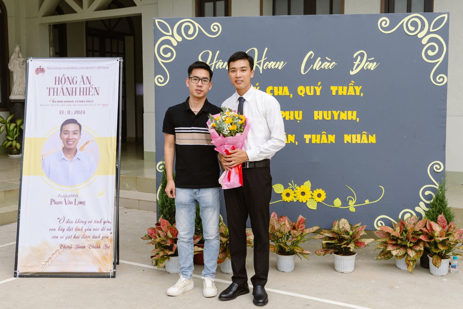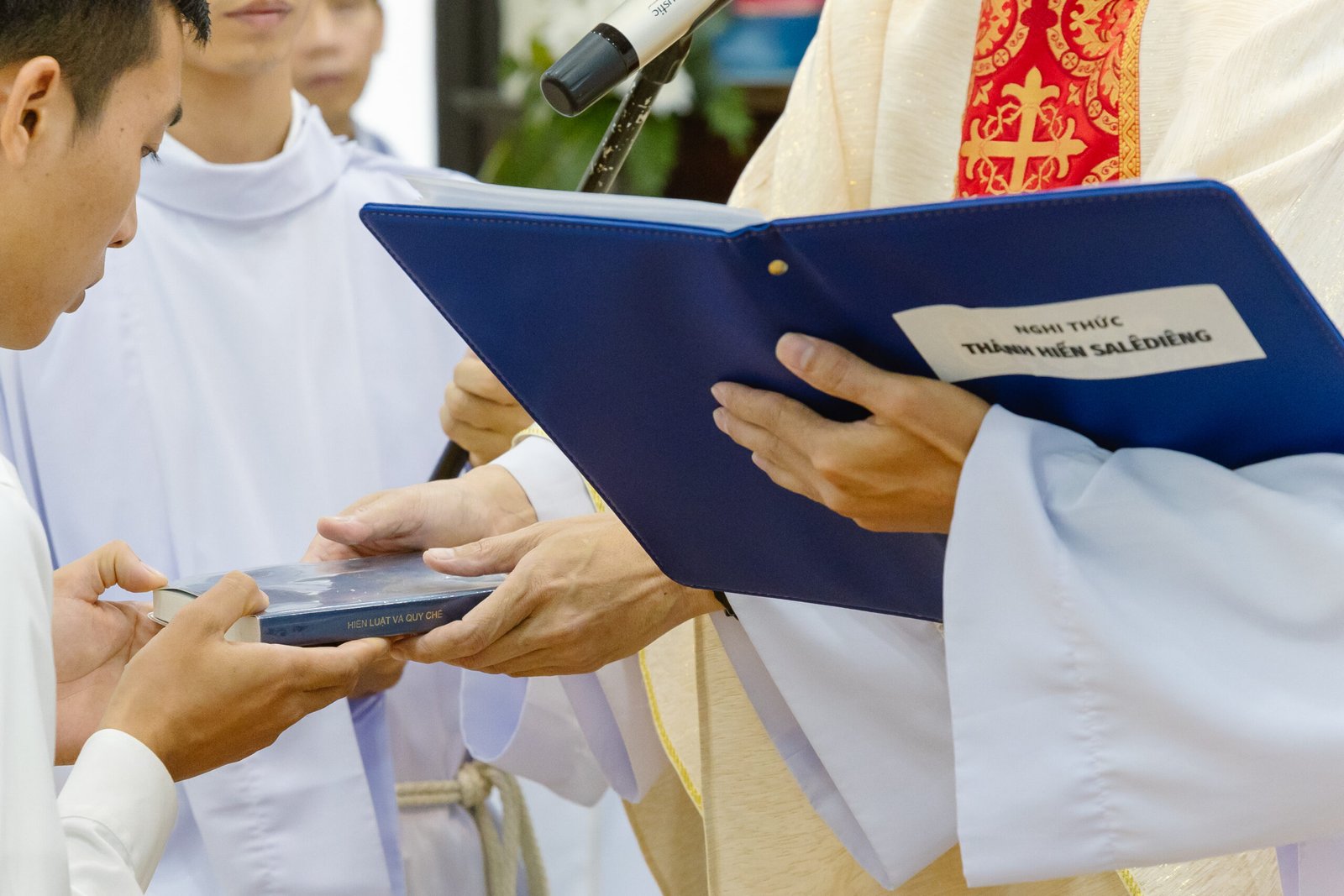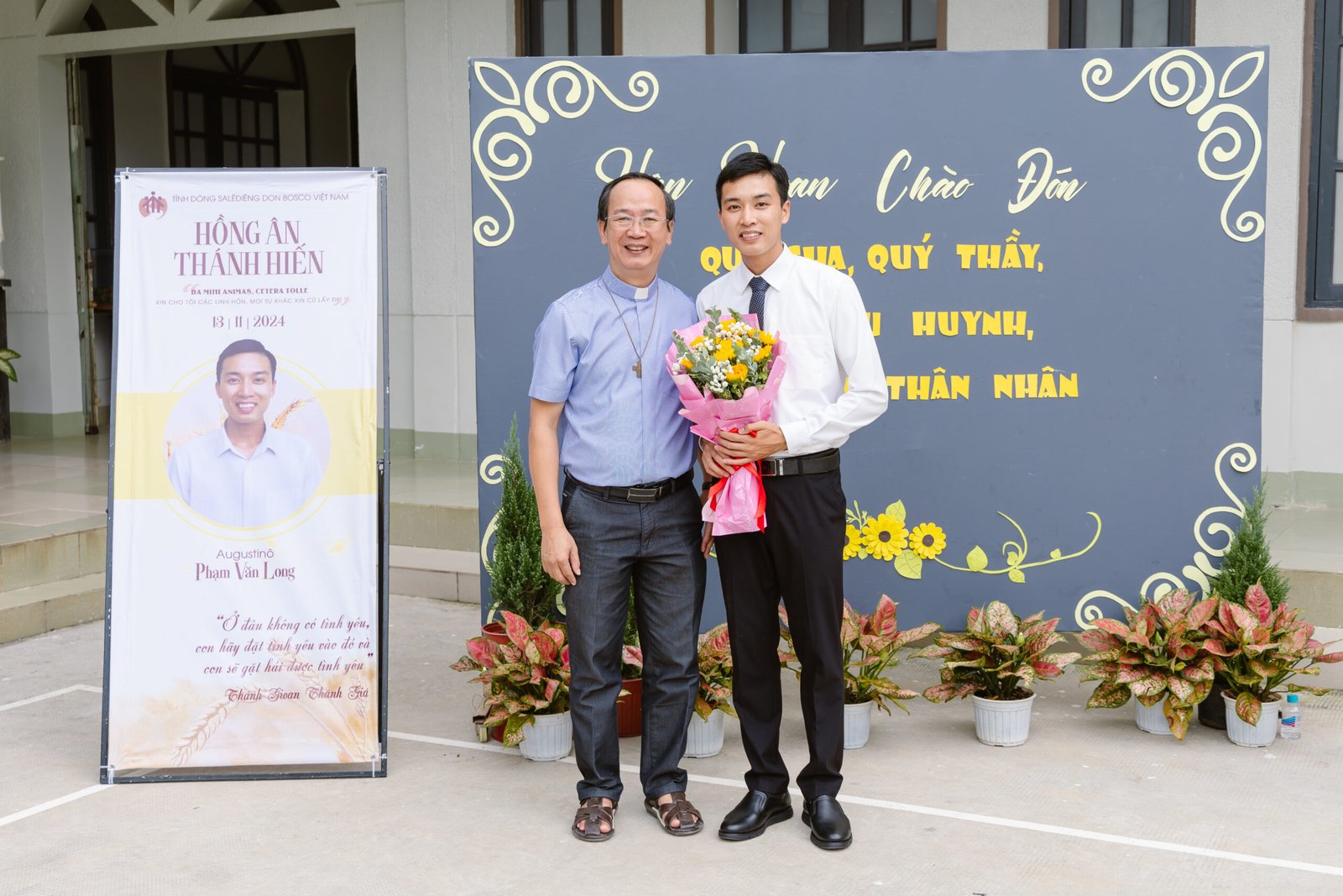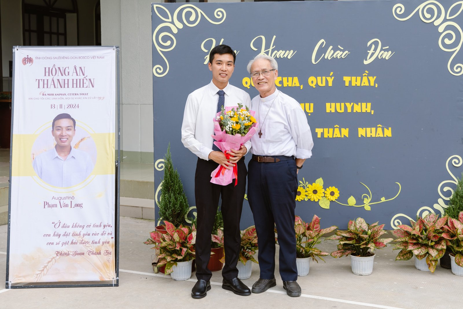 Kết thúc phần giảng lễ là phần nghi thức thánh hiến Salêdiêng: trước sự hiện diện của cha Giám Tỉnh Barnaba đại diện Bề Trên Cả, với sự chứng kiến của hai nhân chứng là cha Gioan Nguyễn Văn Kích và Sư huynh Giuse Phạm Hùng Cường, cùng cộng đoàn dân Chúa, thầy Augustino Phạm Văn Long đã tự do tuyên khấn dâng hiến trọn vẹn đời mình cho Thiên Chúa qua việc cam kết sống vâng phục, nghèo khó và thanh khiết theo đường lối Phúc Âm đã được vạch ra trong Hiến luật Salêdiêng. Nghi thức kết thúc với phần trao huy hiệu và Hiến luật Tu hội. Thánh lễ được tiếp tục với phần phụng vụ Thánh Thể.