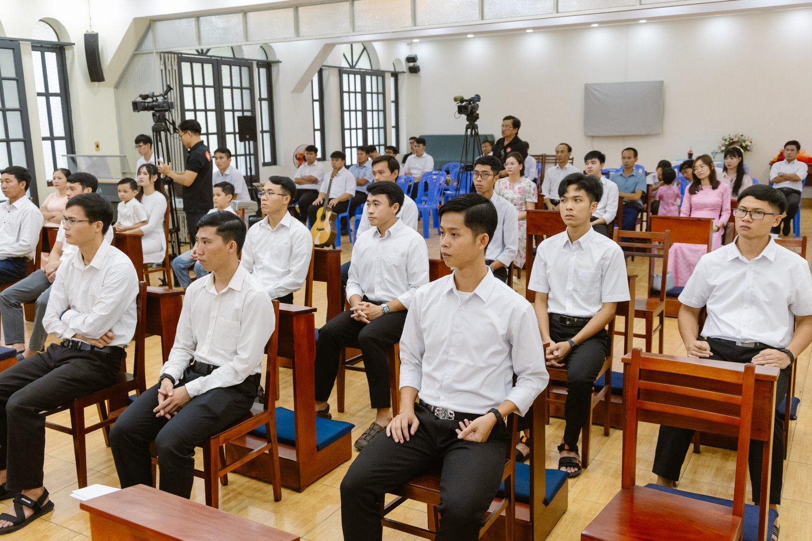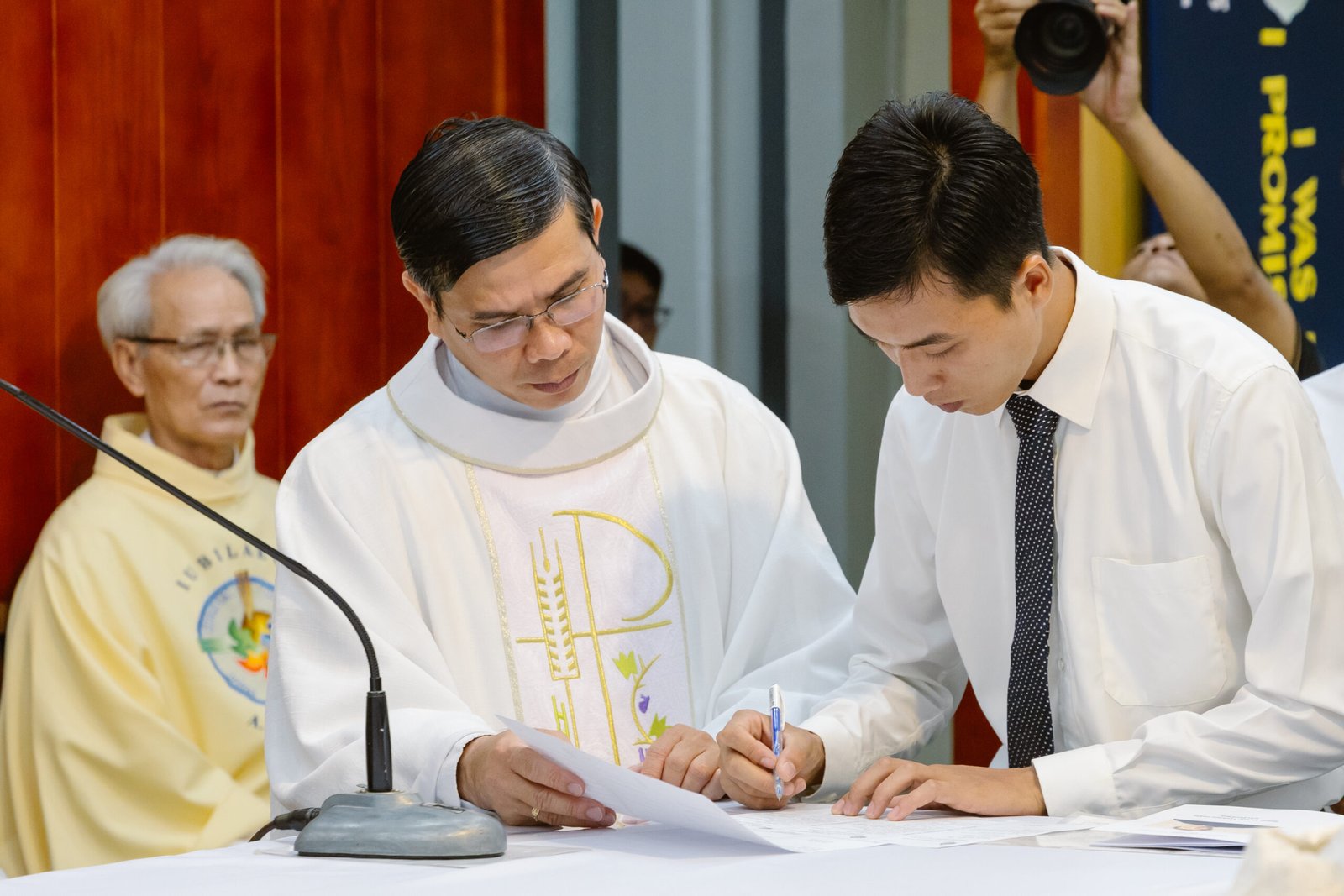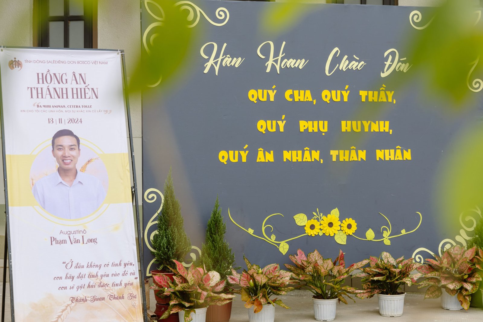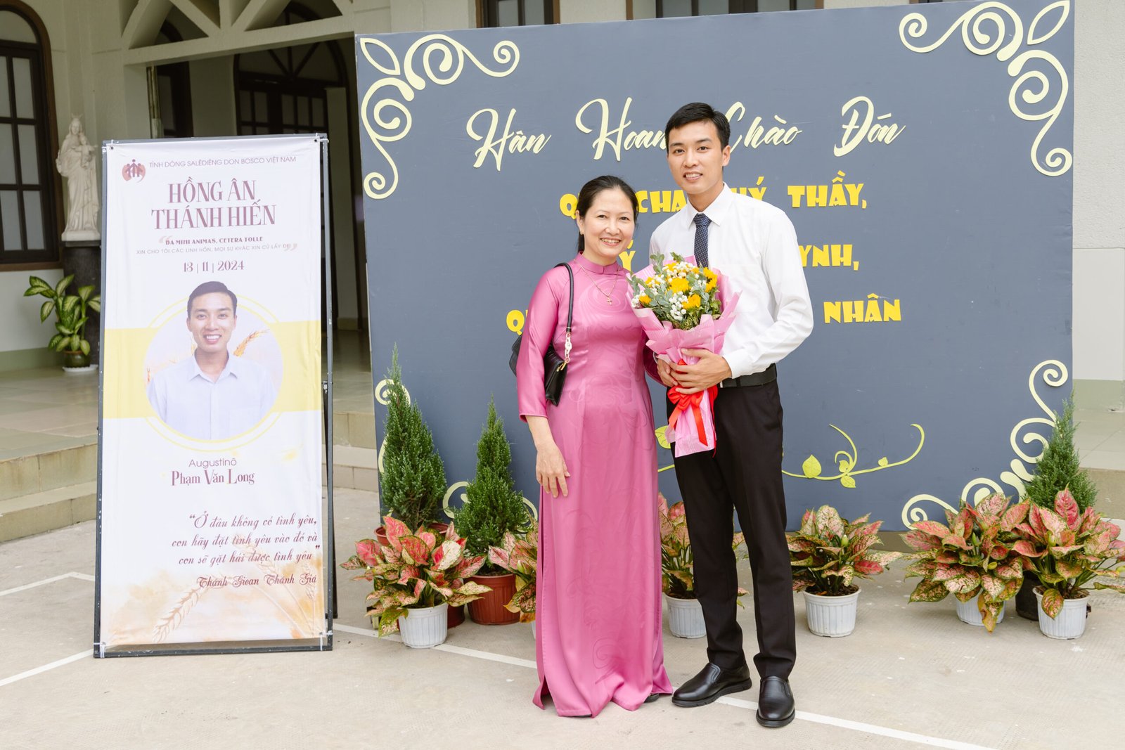 Kết thúc phần giảng lễ là phần nghi thức thánh hiến Salêdiêng: trước sự hiện diện của cha Giám Tỉnh Barnaba đại diện Bề Trên Cả, với sự chứng kiến của hai nhân chứng là cha Gioan Nguyễn Văn Kích và Sư huynh Giuse Phạm Hùng Cường, cùng cộng đoàn dân Chúa, thầy Augustino Phạm Văn Long đã tự do tuyên khấn dâng hiến trọn vẹn đời mình cho Thiên Chúa qua việc cam kết sống vâng phục, nghèo khó và thanh khiết theo đường lối Phúc Âm đã được vạch ra trong Hiến luật Salêdiêng. Nghi thức kết thúc với phần trao huy hiệu và Hiến luật Tu hội. Thánh lễ được tiếp tục với phần phụng vụ Thánh Thể.