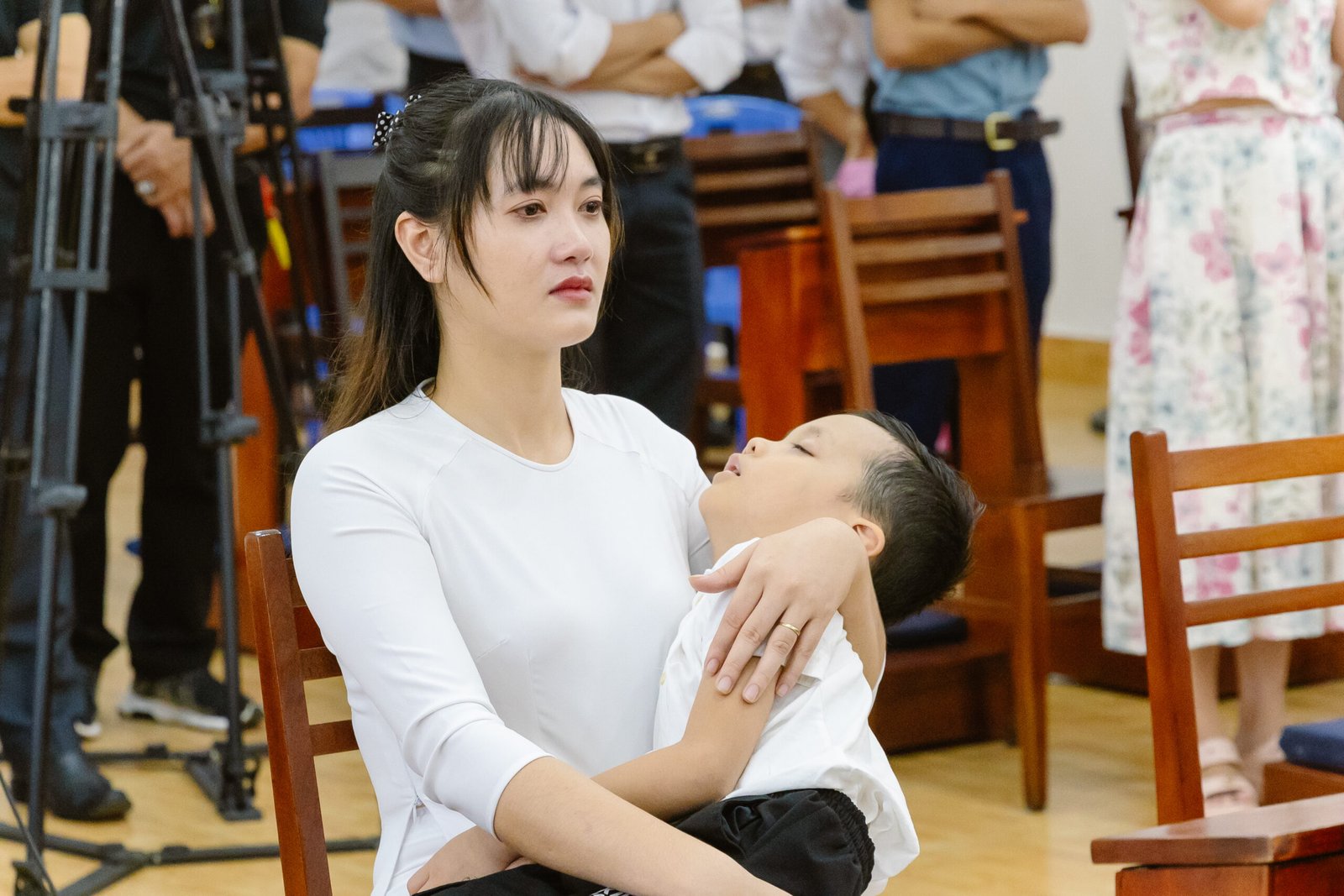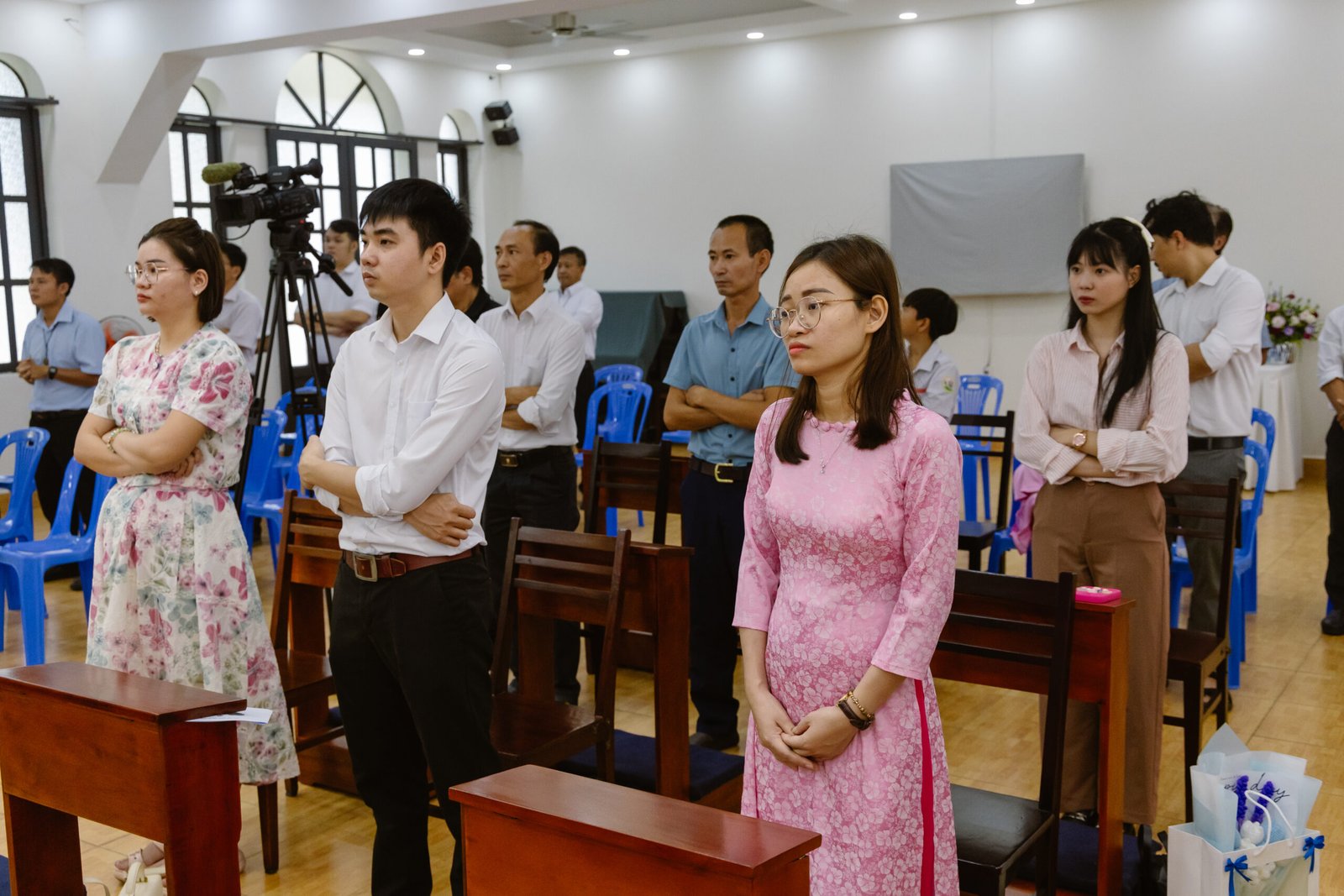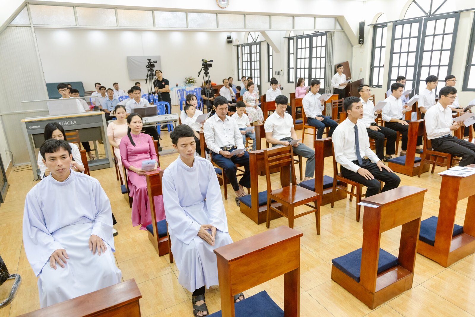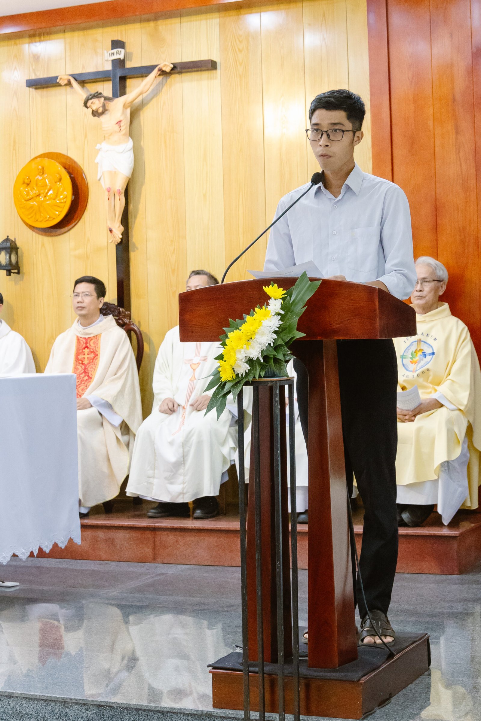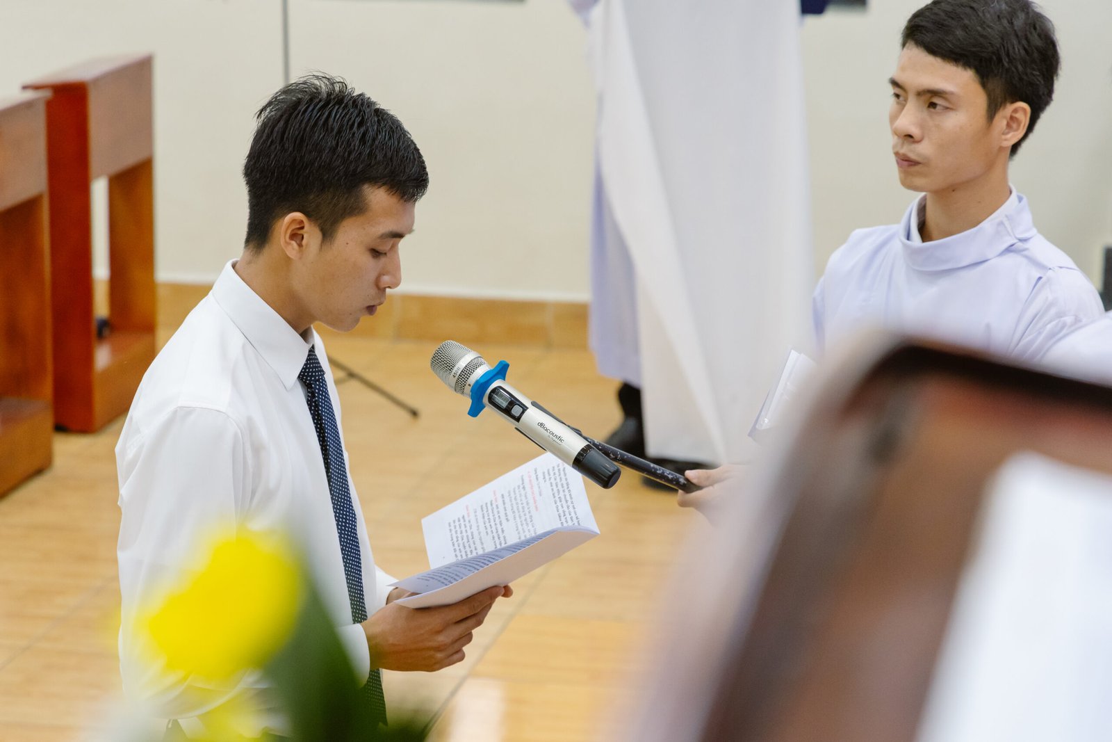 Vào lúc 9h30, anh em Tập sinh đã chào đón sự hiện diện của Cha Giám Tỉnh Barnaba Lê An Phong, cùng quý cha, quý thầy, quý phụ huynh, quý thân nhân của Khấn sinh bằng các bài kèn vui tươi rộn ràng. Ngay sau đó, thánh lễ Tiên khấn và Bổn mạng được diễn ra trong bầu khí thiêng liêng và trang trọng. Thánh lễ được cha Giám Tỉnh Barnaba chủ sự. Đồng tế với ngài có cha Giám đốc Cộng thể Thánh Tâm Ba Thôn, cha Tập sư và quý cha Salêdiêng.