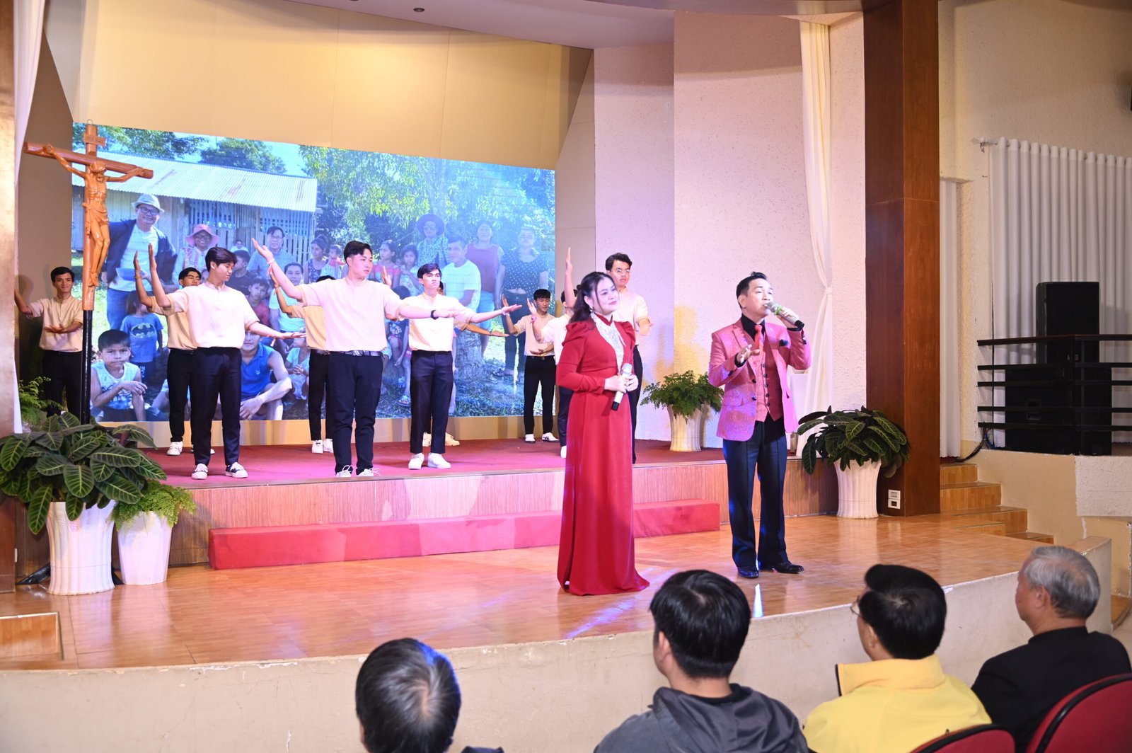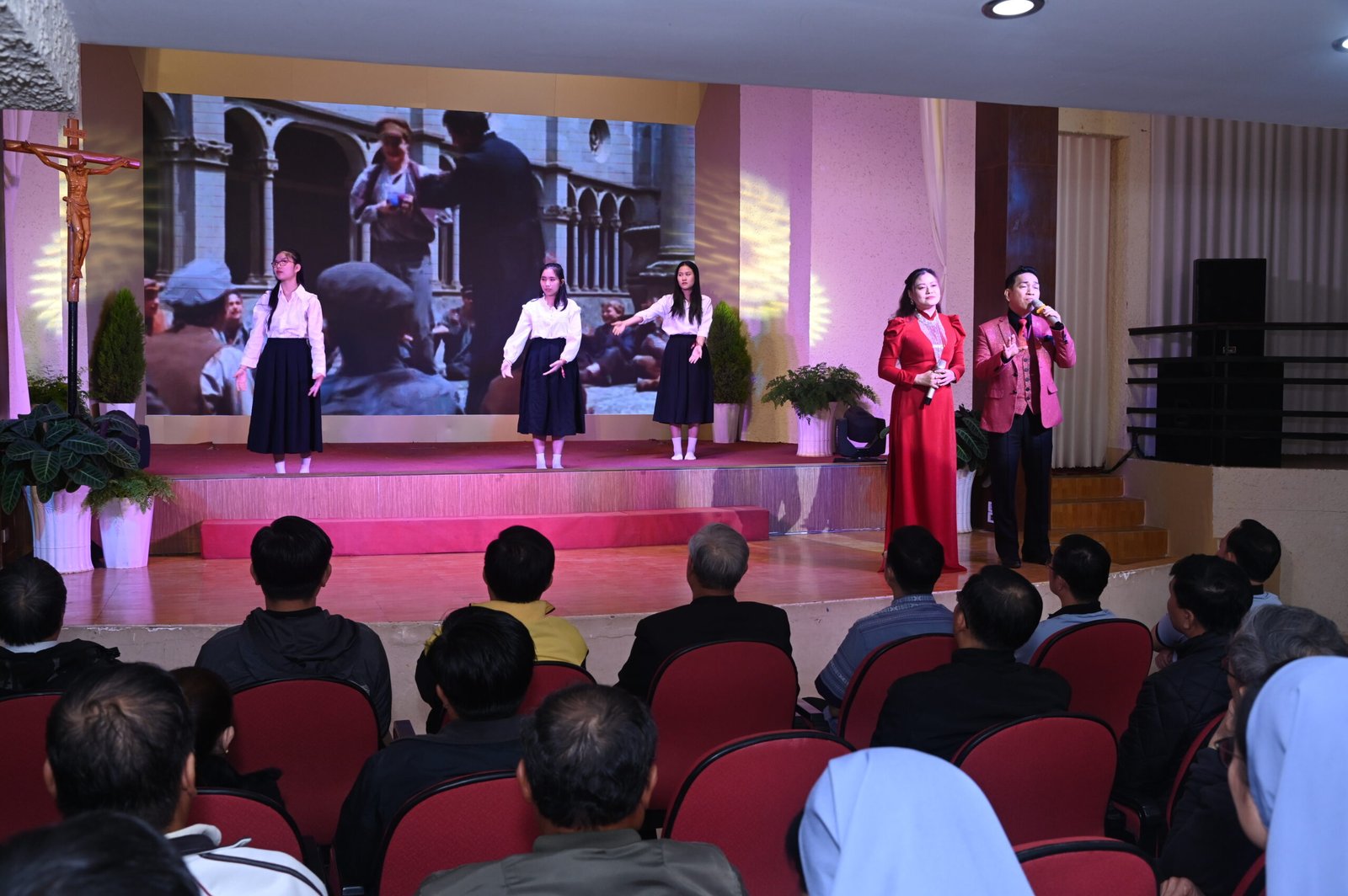 Sau bài chia sẻ của Cha Gioan Bosco, 2 ca sĩ Xuân Trường và Hoài Uyên thể hiện ca khúc “Một đời tạ ơn”của Cha Đa minh Trần Quang Hiền (SDB), nhóm sinh viên SoB múa phụ họa.