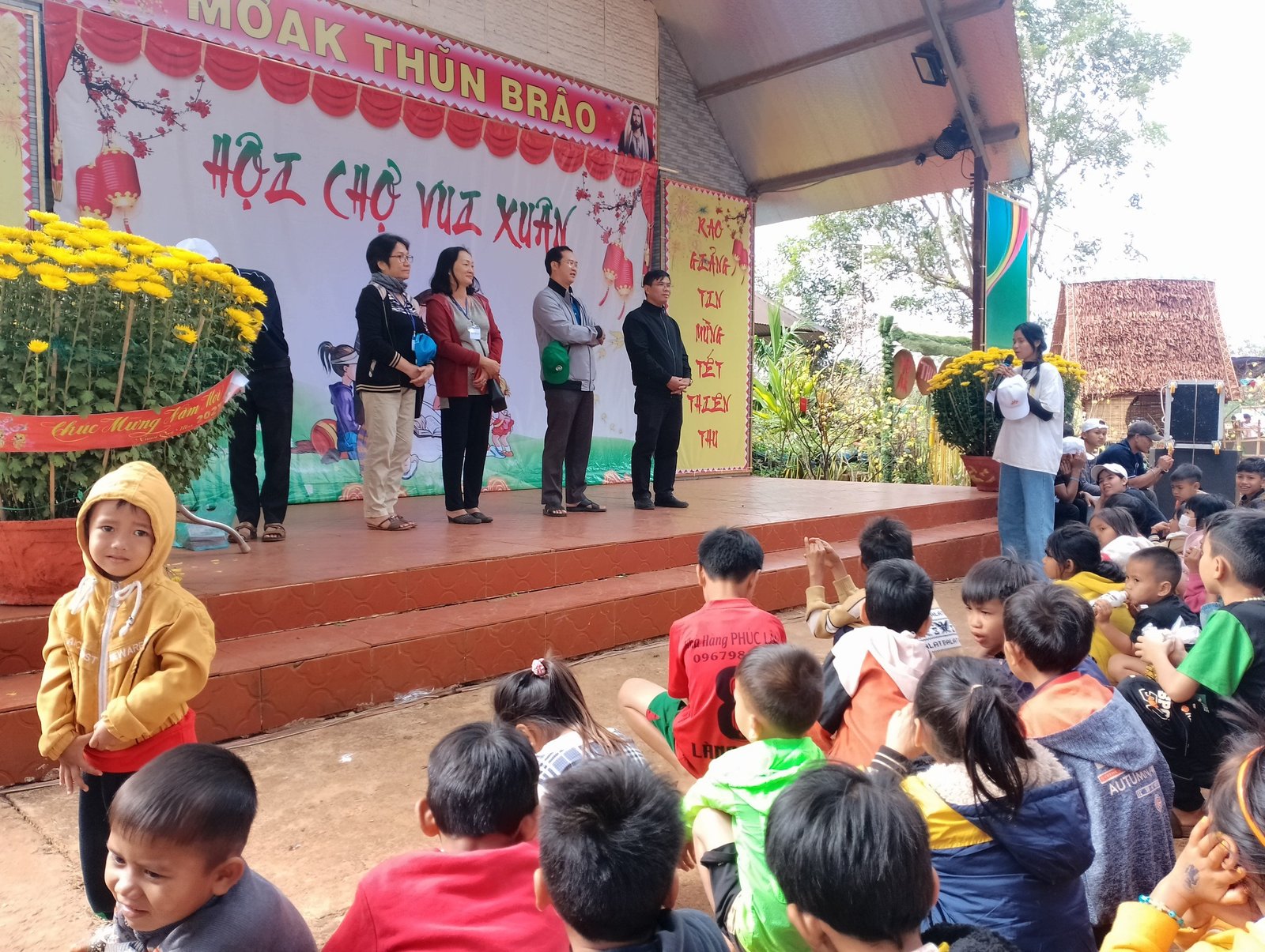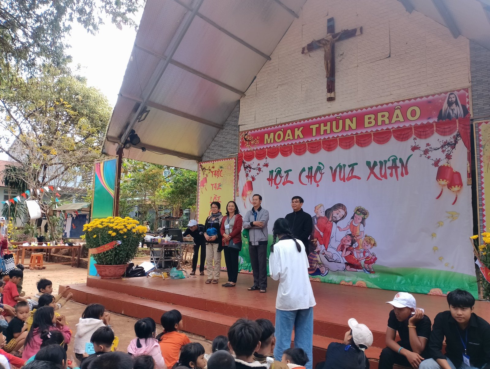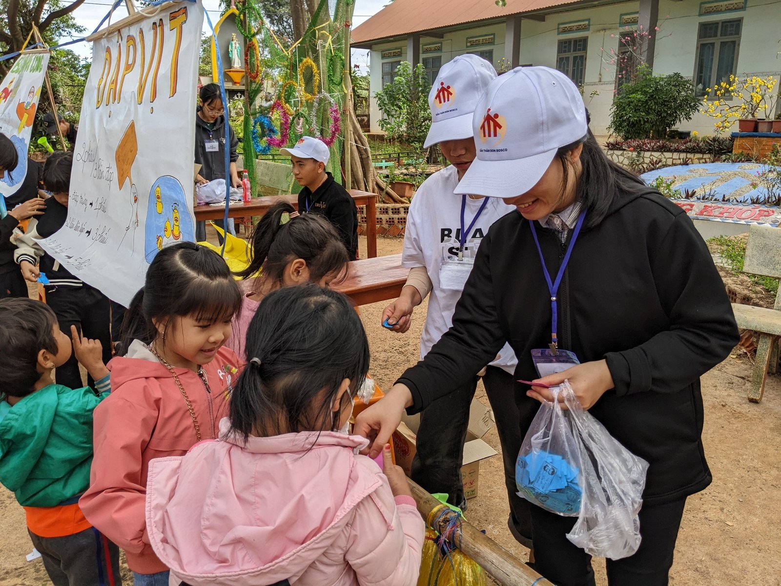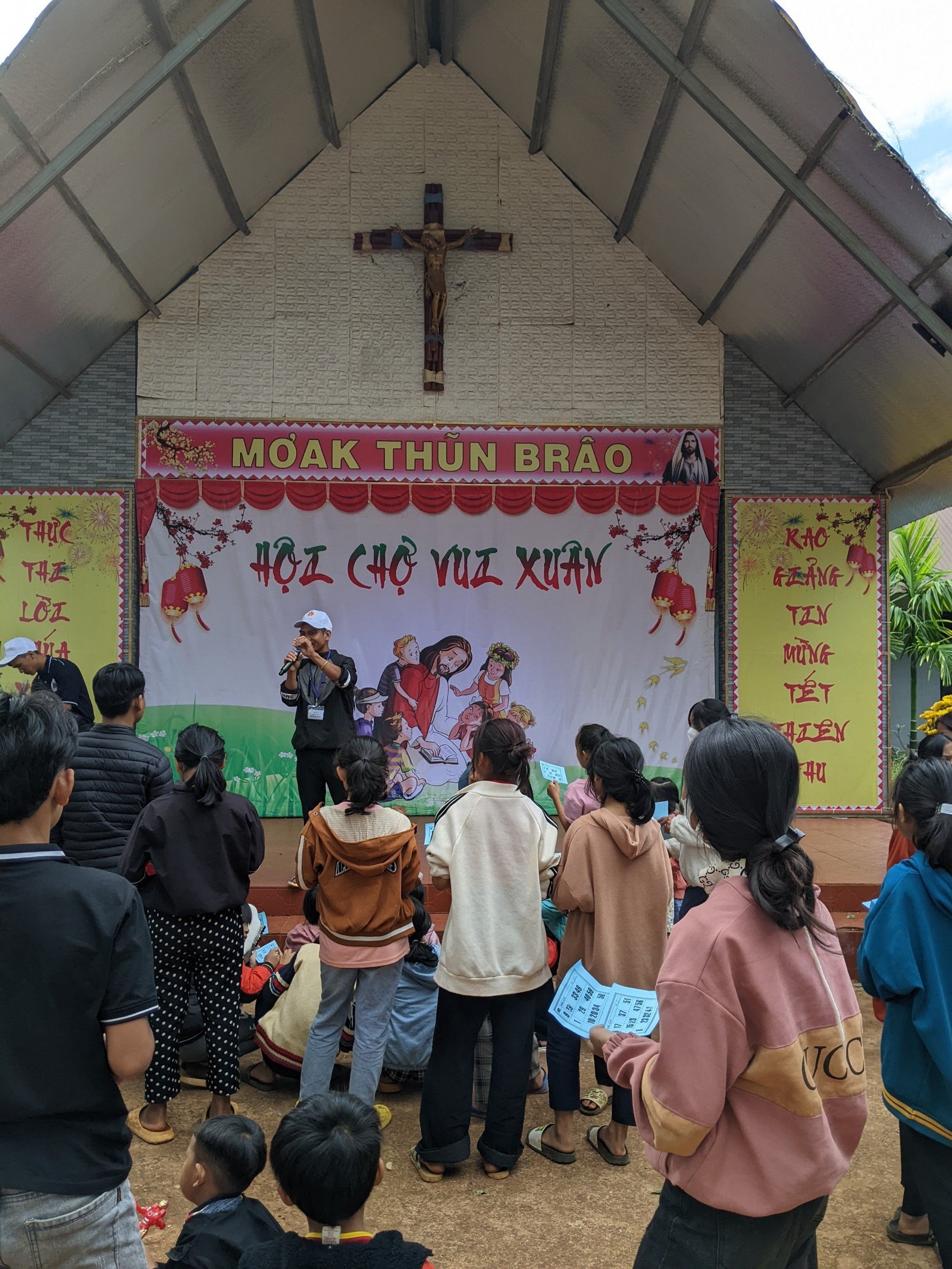 Sau gần 10 tiếng, đoàn đã có mặt và kịp giờ tham dự Thánh lễ sáng mang đậm chất văn hóa bản địa với anh chị em đồng bào địa phương. Khoảng 7h sáng ngày mùng 3 Tết, sau bữa sáng nhẹ, mọi người cùng nhau chuẩn bị các gian trò chơi, khu ẩm thực, khu siêu thị cùng với các bạn trẻ trong giáo xứ. Đầu giờ chiều, mọi người cùng nhau đi thăm hỏi, chúc tết và tặng một ít phần quà cho các gia đình có hoàn cảnh đặc biệt khó khăn. Những phần quà thiết thực như: chăn, mền, áo, gạo, nhu yếu phẩm… được gửi trao và những lời cầu chúc cho các gia đìn có thêm chút niềm vui trong những ngày xuân.
