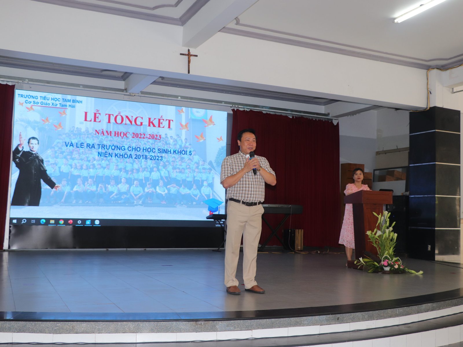 Mở đầu cho buổi lễ tổng kết năm học 2022-2023, Cha Chánh xứ Phêrô Phạn Quốc Hùng có đôi lời tri gởi đến quý BGH của Trường tiểu học Tam Bình, quý Thầy Cô giáo Trường phổ cập Don Bosco Tam Hải, HĐMV Giáo xứ Tam Hải, ban Caritas Tam Hải, bếp ăn Nụ Cười Xinh, quý Phụ huynh, quý Ân nhân và toàn thể học sinh có mặt hôm nay. Ngài cám ơn tất cả mọi người đã luôn đồng hành với Giáo xứ và nhà trường để chăm lo cho các em đang theo học tại Trường phổ cập Don Bosco Tam Hải này có một môi trường học tập tốt đẹp và đầy đủ nhất. Sau những lời cám ơn gởi đến mọi người, Ngài tuyên bố buổi lễ tổng kết năm học 2022-2023 và Lễ ra trường của khối lớp 5 chính thức bắt đầu.