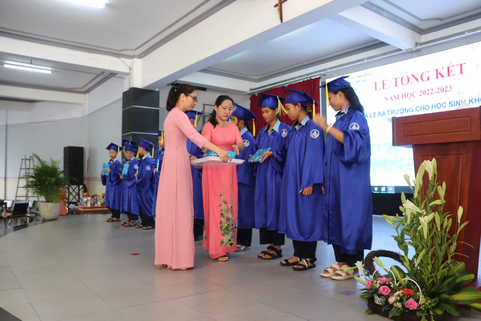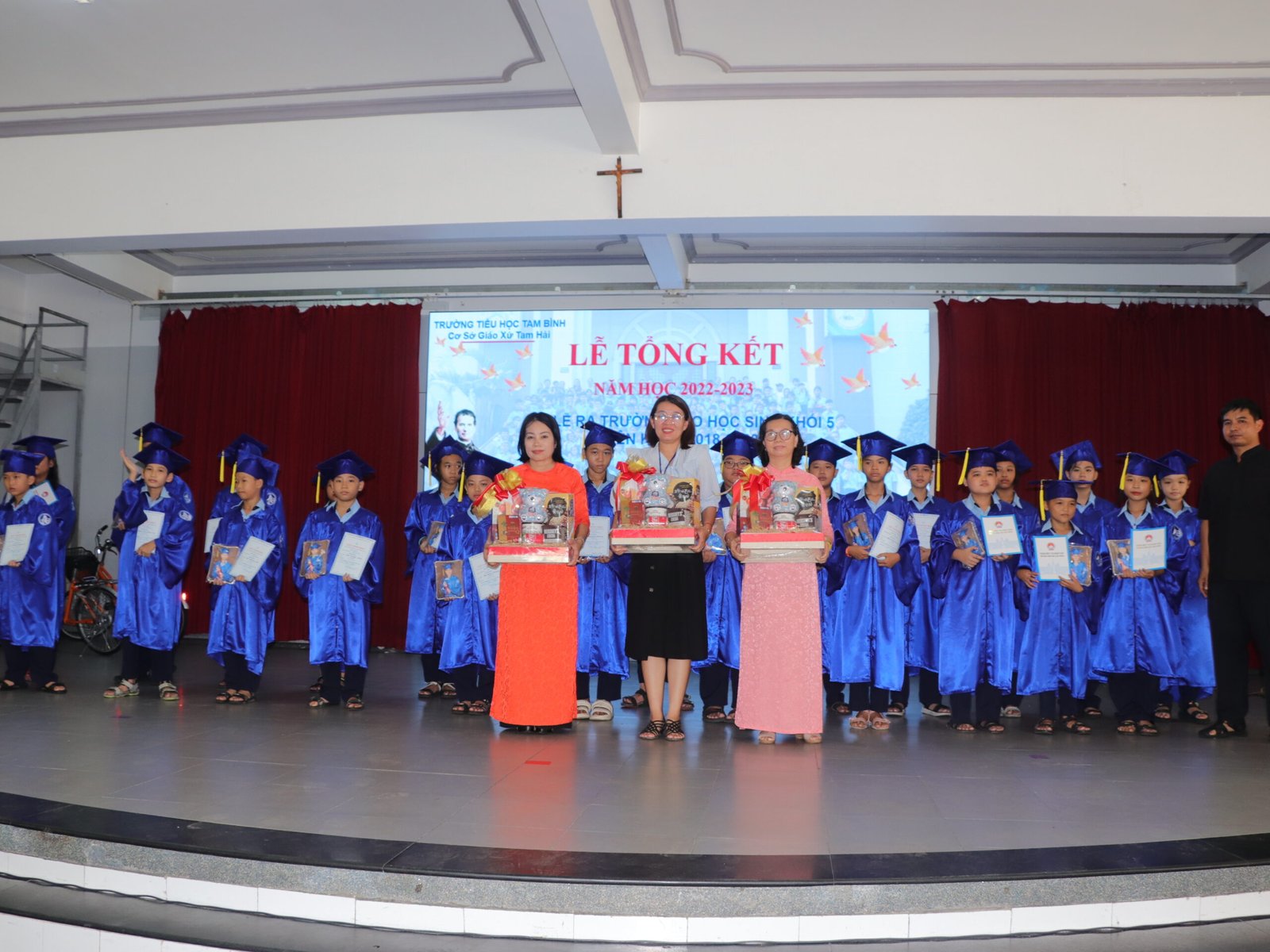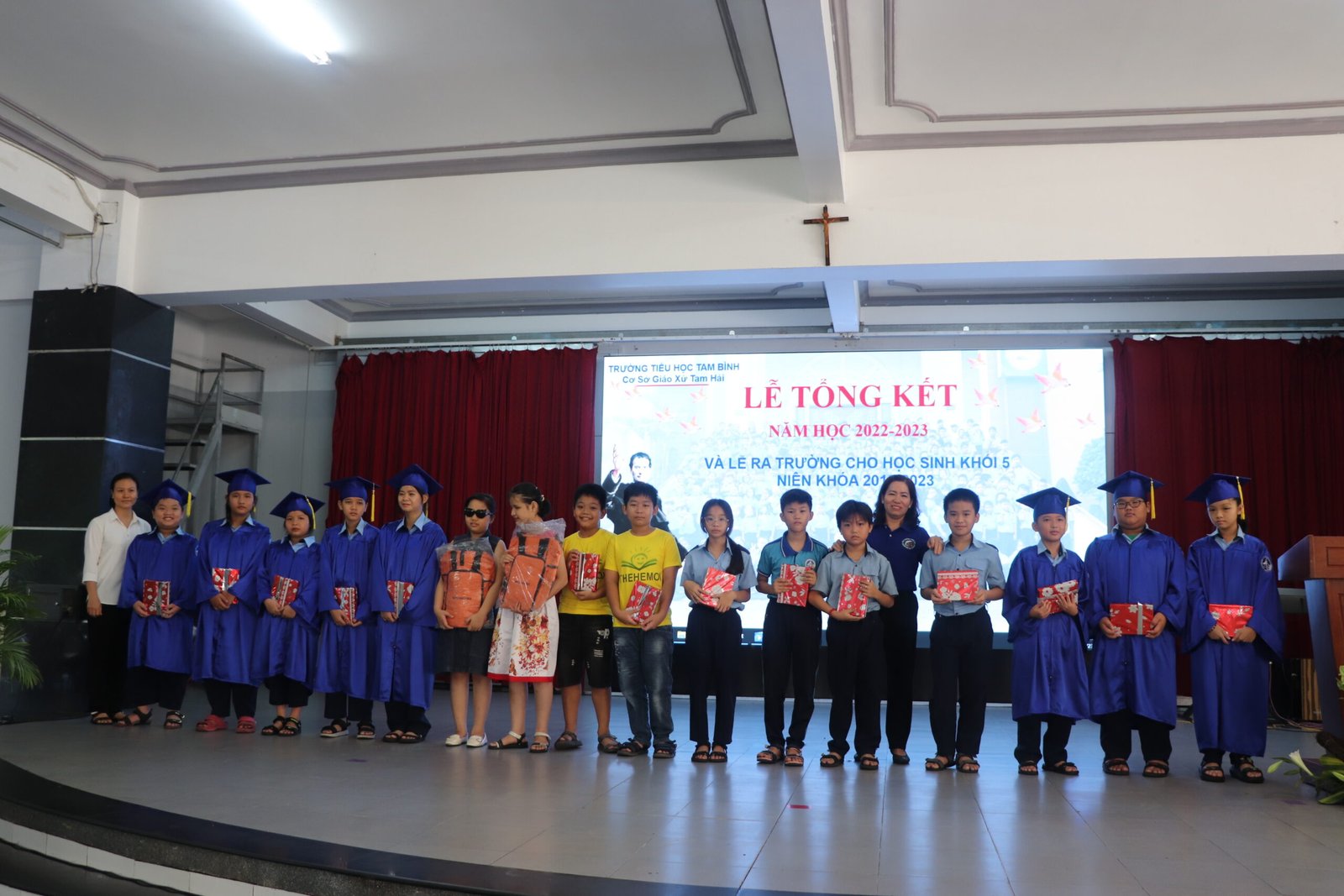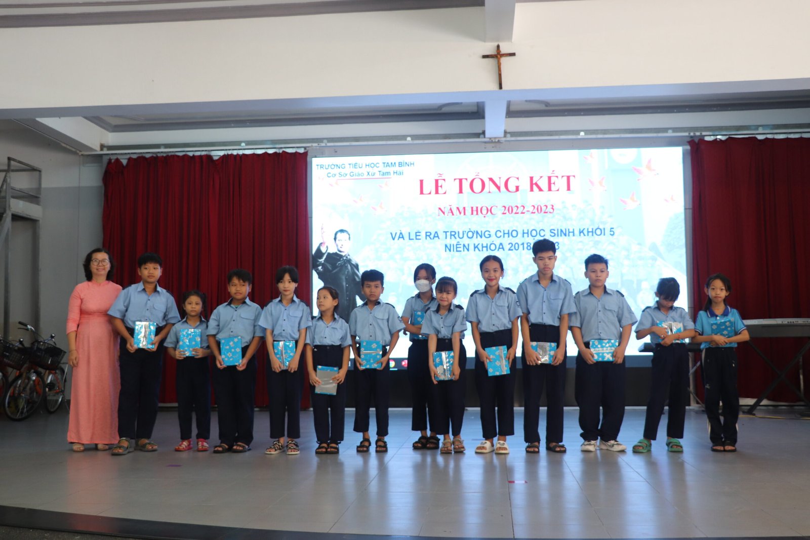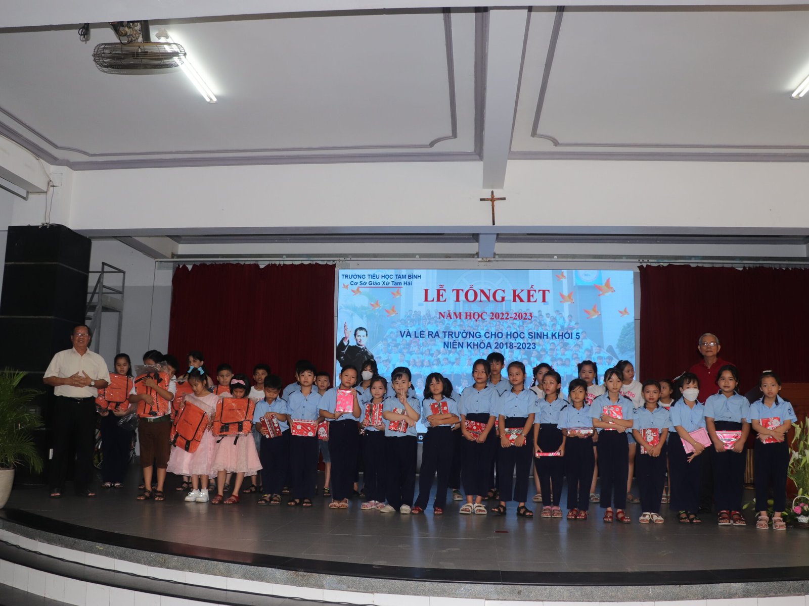 Phần tiếp theo của buổi lễ tổng kết là phần trao thưởng kết thúc năm học dành cho các em có thành tích học tập tốt. Ban Caritas Tam Hải cũng có những phần quà thiết thực và ý nghĩa dành tặng các em có hoàn cảnh đặc biệt. Những phần quà tuy không lớn nhưng nó đã khích lệ được tinh thần học tập của các em, để các em mỗi ngày cố gắng hơn trong học tập. Xen lẫn lễ phát thưởng là phần biểu diễn văn nghệ của các em. Những tiếc mục văn nghệ được các em tập dợt và chuẩn bị rất chu đáo. Các em đã gởi đến mọi người có mặt trong hội trường hôm nay những tiếc mục biểu diễn đầy cảm xúc. Những giọt nước mắt đã lăn trên má của các em cũng như mọi người tham dự trong ngày hôm nay. Những giọt nước mắt hạnh phúc của thầy và trò trong ngày tổng kết và chia tay khối lớp 5 thật ý nghĩa.