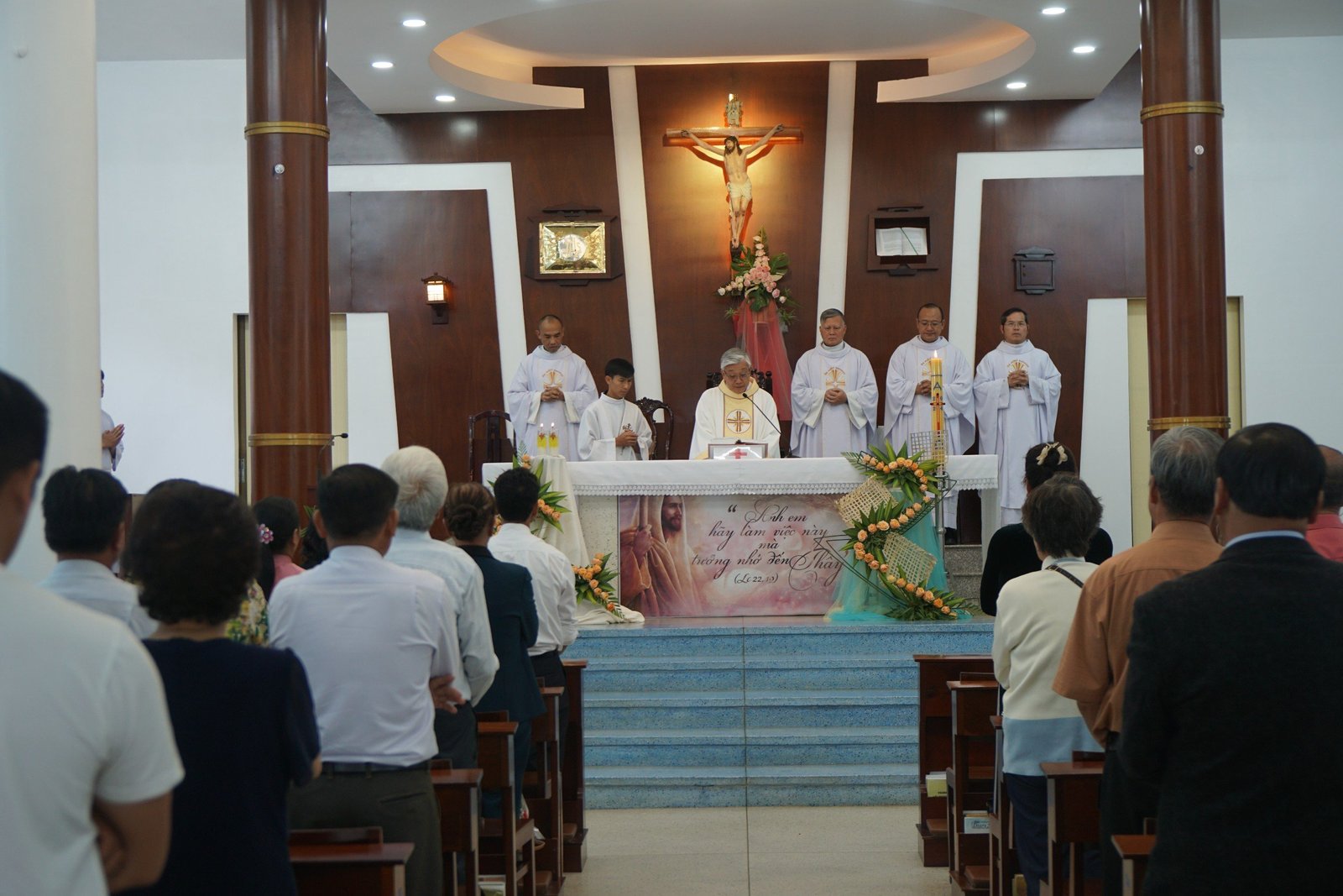 Sau những phút giao lưu, giải lao. Cha giám đốc Tôma Vũ Kim Long chủ sự Thánh Lễ tạ ơn nhân ngày Bế giảng năm học 2023-2024. Trong bài giảng, Cha Tôma mời gọi mọi người bước vào mối tương quan “ở lại” với Chúa, từ đó sống với một tình yêu thương đích thực: quên mình để nghĩ đến người khác, sẵn sàng cho đi, sẵn sàng hi sinh và chấp nhận thiệt thòi.