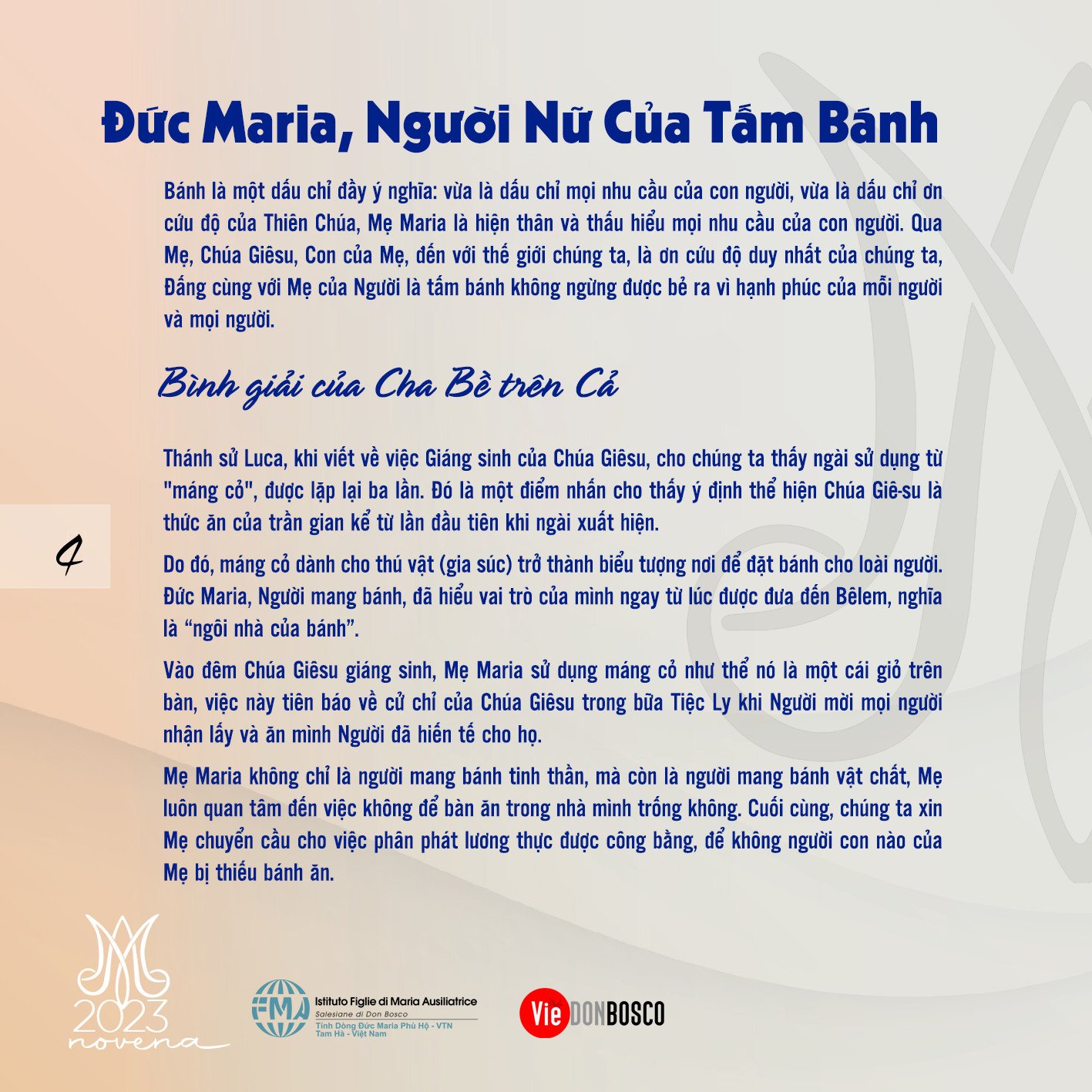 Thánh sử Luca, khi viết về việc Giáng sinh của Chúa Giêsu, cho chúng ta thấy ngài sử dụng từ “máng cỏ”, được lặp lại ba lần. Đó là một điểm nhấn cho thấy ý định thể hiện Chúa Giê-su là thức ăn của trần gian kể từ lần đầu tiên khi ngài xuất hiện. Do đó, máng cỏ dành cho thú vật (gia súc) trở thành biểu tượng nơi để đặt bánh cho loài người. Đức Maria, Người mang bánh, đã hiểu vai trò của mình ngay từ lúc được đưa đến Bêlem, nghĩa là “ngôi nhà của bánh”. Vào đêm Chúa Giêsu giáng sinh, Mẹ Maria sử dụng máng cỏ như thể nó là một cái giỏ trên bàn, việc này tiên báo về cử chỉ của Chúa Giêsu trong bữa Tiệc Ly khi Người mời mọi người nhận lấy và ăn mình Người đã hiến tế cho họ. Mẹ Maria không chỉ là người mang bánh tinh thần mà còn là người mang bánh vật chất, Mẹ luôn quan tâm đến việc không để bàn ăn trong nhà mình trống không. Cuối cùng, chúng ta xin Mẹ chuyển cầu cho việc phân phát lương thực được công bằng, để không người con nào của Mẹ bị thiếu bánh ăn.