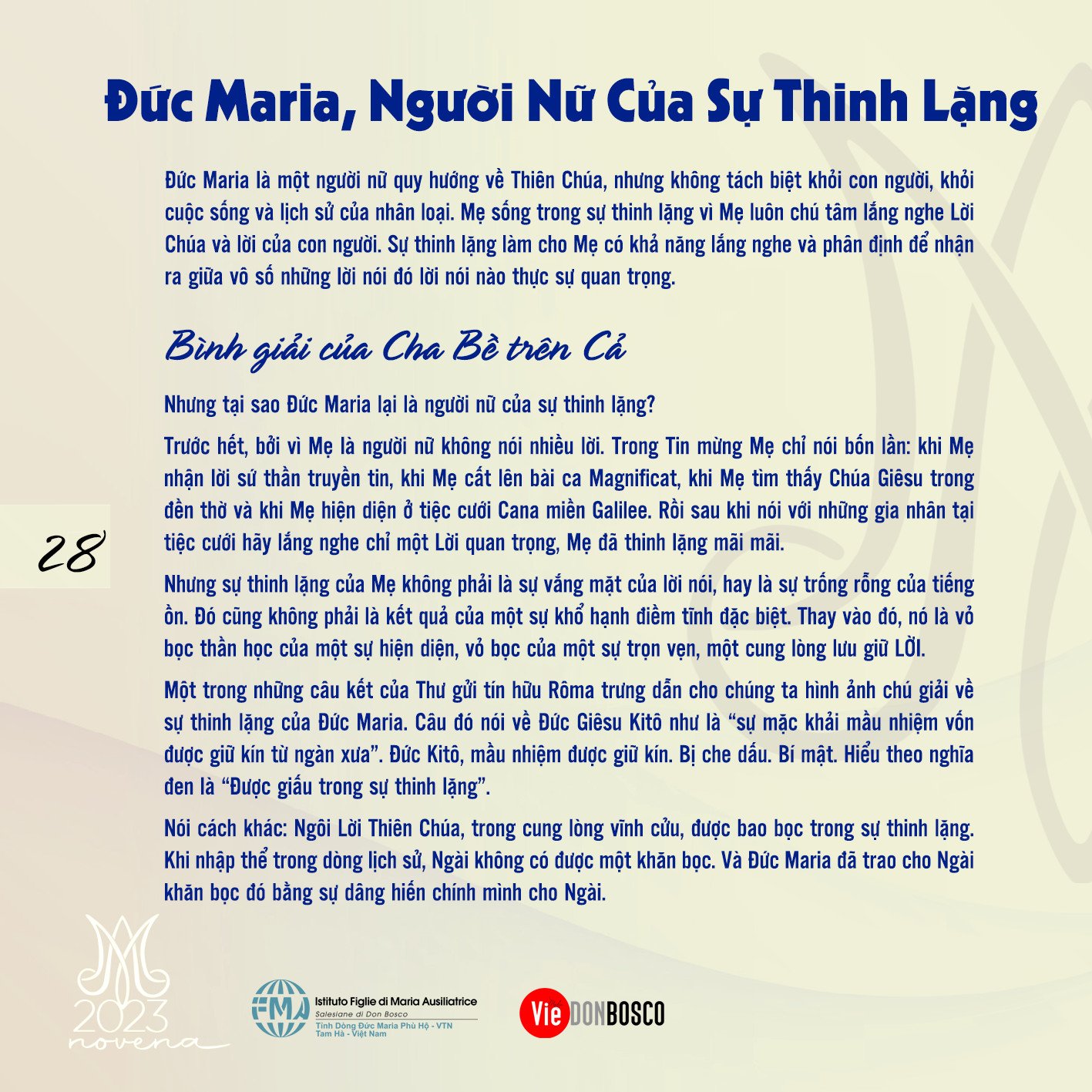 Nhưng sự thinh lặng của Mẹ không phải là sự vắng mặt của lời nói, hay là sự trống rỗng của tiếng ồn. Đó cũng không phải là kết quả của một sự khổ hạnh điềm tĩnh đặc biệt. Thay vào đó, nó là vỏ bọc thần học của một sự hiện diện, vỏ bọc của một sự trọn vẹn, một cung lòng lưu giữ LỜI.