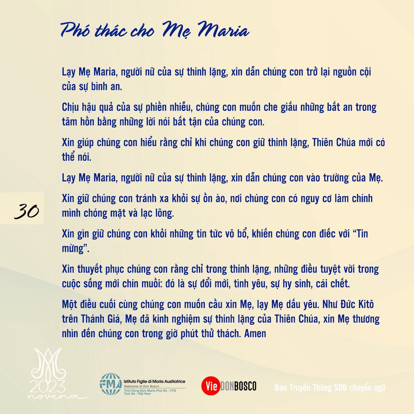 Lạy Mẹ Maria, người nữ của sự thinh lặng, xin dẫn chúng con trở lại nguồn cội của sự bình an.