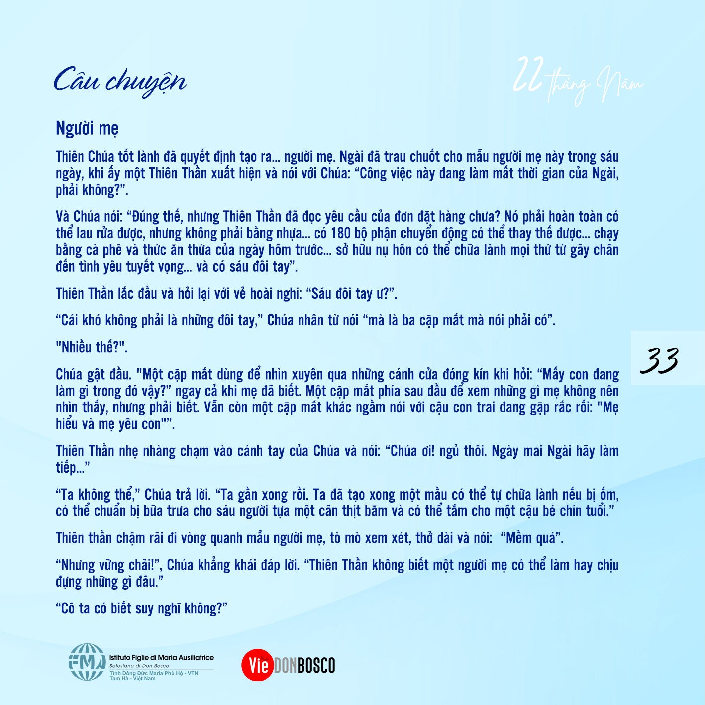 Thiên Chúa tốt lành đã quyết định tạo ra… người mẹ. Ngài đã trau chuốt cho mẫu người mẹ này trong sáu ngày, khi ấy một Thiên Thần xuất hiện và nói với Chúa: “Công việc này đang làm mất thời gian của Ngài, phải không?”.