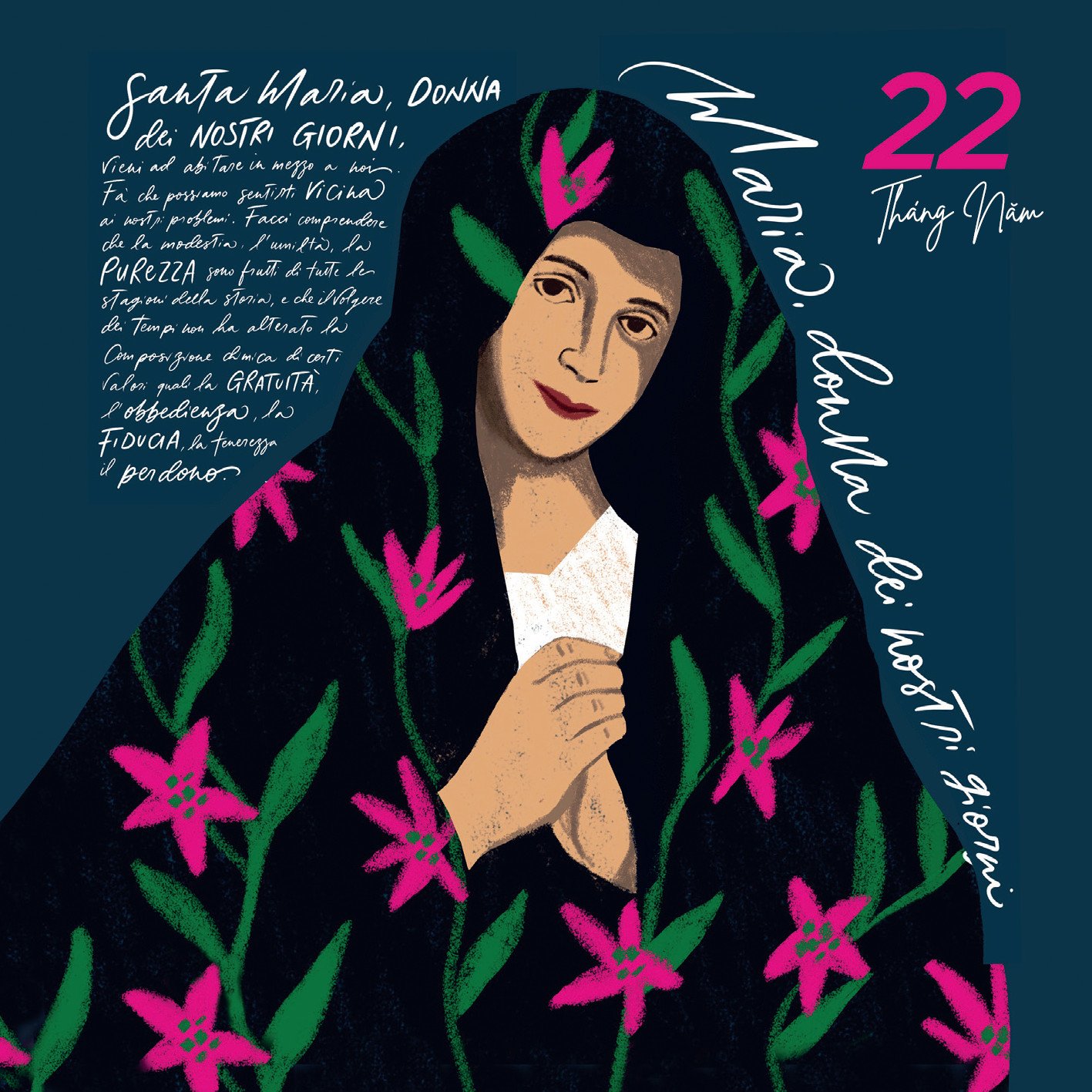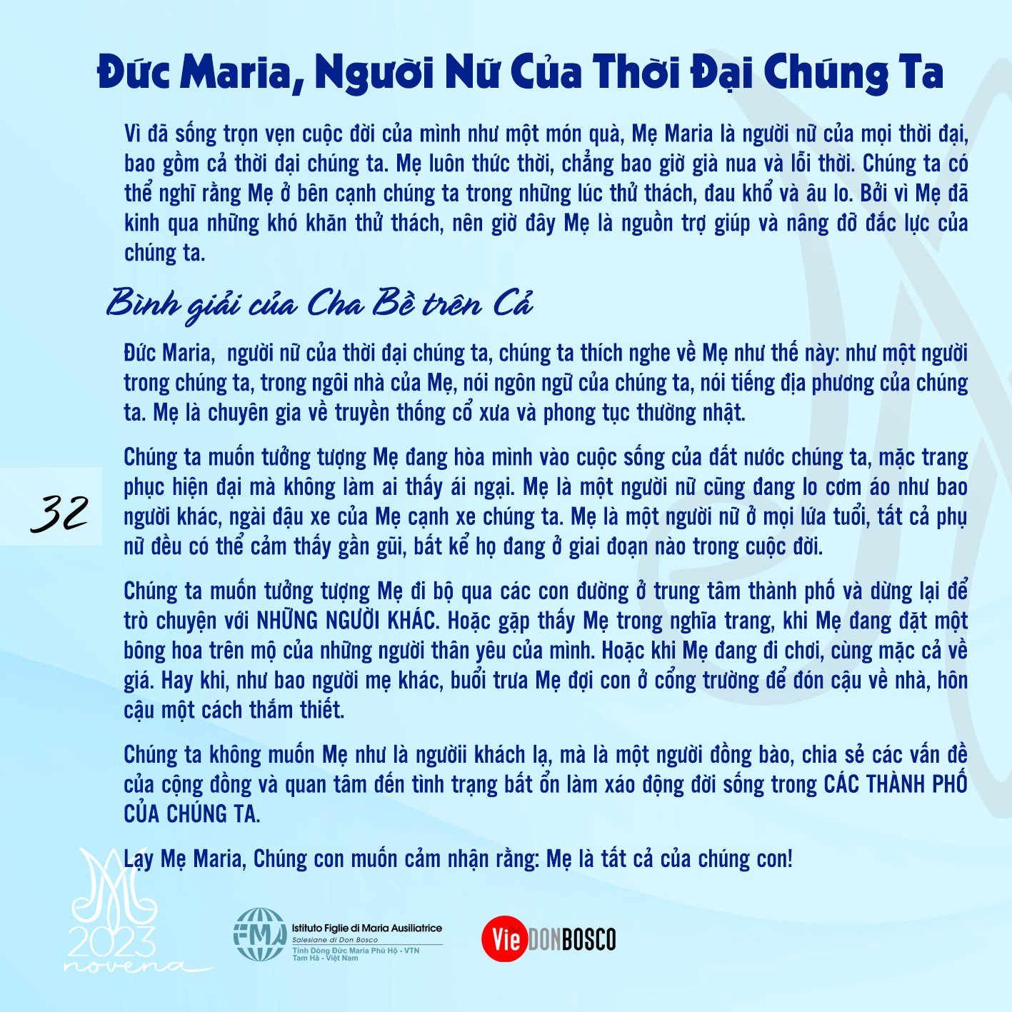 Chúng ta muốn tưởng tượng Mẹ đang hòa mình vào cuộc sống của đất nước chúng ta, mặc trang phục hiện đại mà không làm ai thấy ái ngại. Mẹ là một người nữ cũng đang lo cơm áo như bao người khác, ngài đậu xe của Mẹ cạnh xe chúng ta. Mẹ là một người nữ ở mọi lứa tuổi, tất cả phụ nữ đều có thể cảm thấy gần gũi, bất kể họ đang ở giai đoạn nào trong cuộc đời.